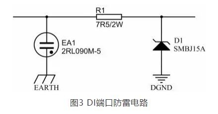 在圖3和圖4中,我們可以看到AI防雷保護電路與DI防雷保護電路存在的區別,在DI防雷保護電路中我們使用了功率電阻R1(7.5Ω/2W),R1應滿足R1≥(U1 -U2) /I1,其中U1為測得空氣放電管的沖擊擊穿電壓值,U2為TVS管最高鉗位電壓,I1為查TVS器件手冊得到TVS管8/20us沖擊電流下的最大通流量。