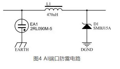在AI防雷電路中由于需要對4~20mA電流和電壓進行測量,因此我們在精度范圍內采用電感L1而沒有使用電阻,L1應滿足L1≥(U1 - U2) × (T2 - T1) / (I1 /2),電感L1的取值計算方法為:以8/20us沖擊電流為準,測得在設計通流容量下壓敏電阻的殘壓值U1,查TVS器件手冊得到8/20us沖擊電流作用下TVS管的最大通流量I1、以及TVS管最高鉗位電壓U2,8/20us沖擊電流的視在波頭時間T1=8us,視在半峰值時間T2=20us